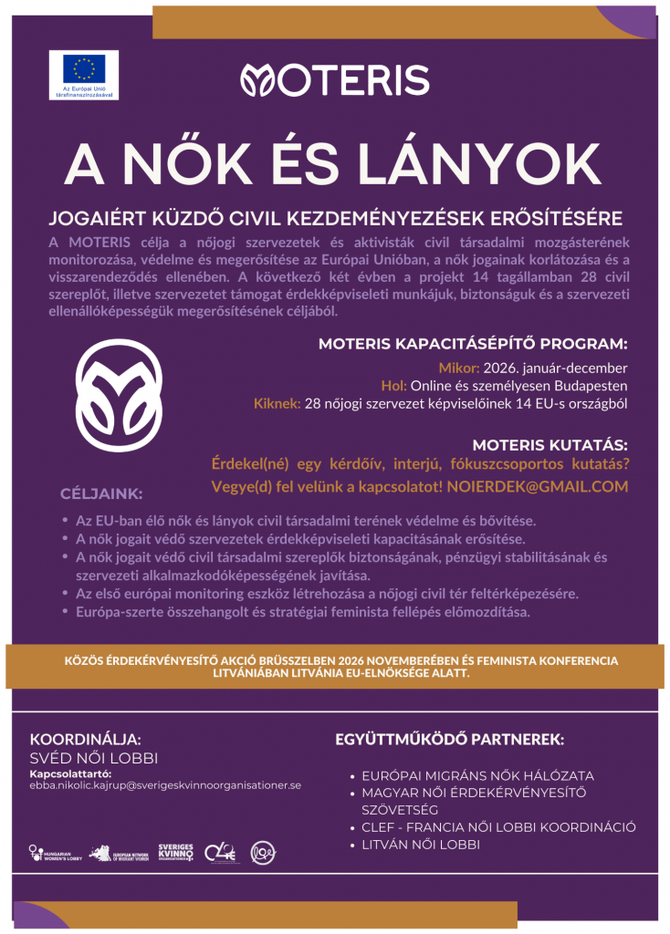 A két évig tartó projektet a Svéd Női Lobbi koordinálja, nemzetközi partnerségben többek között a Magyar Női Érdekérvényesítő Szövetséggel, a CLEF Francia Női Lobbi Koordinációval, a Litván Női Lobbi szervezetével és az Európai Migráns Nők Hálózatával. A MOTERIS kollektív feminista választ kíván adni a demokratikus tér szűkülésére, amely egyre súlyosabban érinti a nők jogain dolgozó civil szervezeteket – a jogi és pénzügyi akadályoktól a digitális zaklatásig. A program a kutatás, képzés és érdekképviselet eszközeivel dolgozik azon, hogy megerősítse a közösségi szinten kitartóan tevékenykedő nőjogi szervezeteket, és stratégiai európai szintű összefogást hozzon létre.